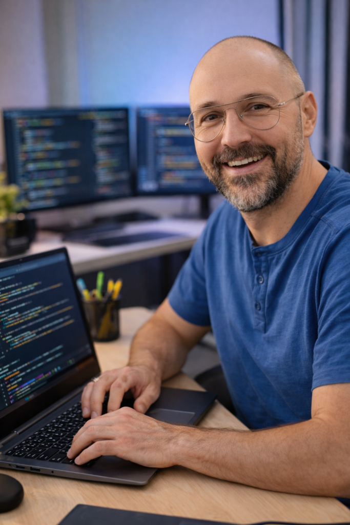 Peter zit achter het scherm, de wereld als canvas klaar,
